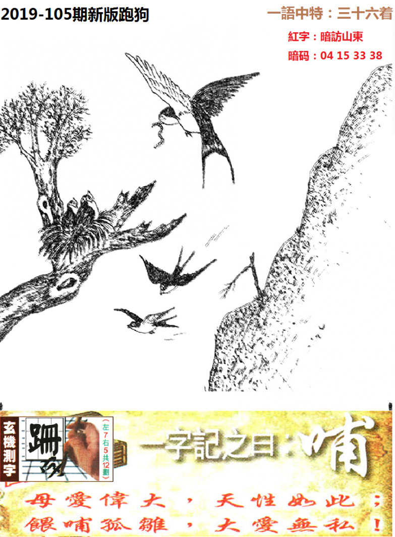 105期新版跑狗一字記之曰:【哺】 母愛偉大,天性如此; 餵哺孤雛,大愛無私! 玄機測字:《跚》 一語中特:三十六着