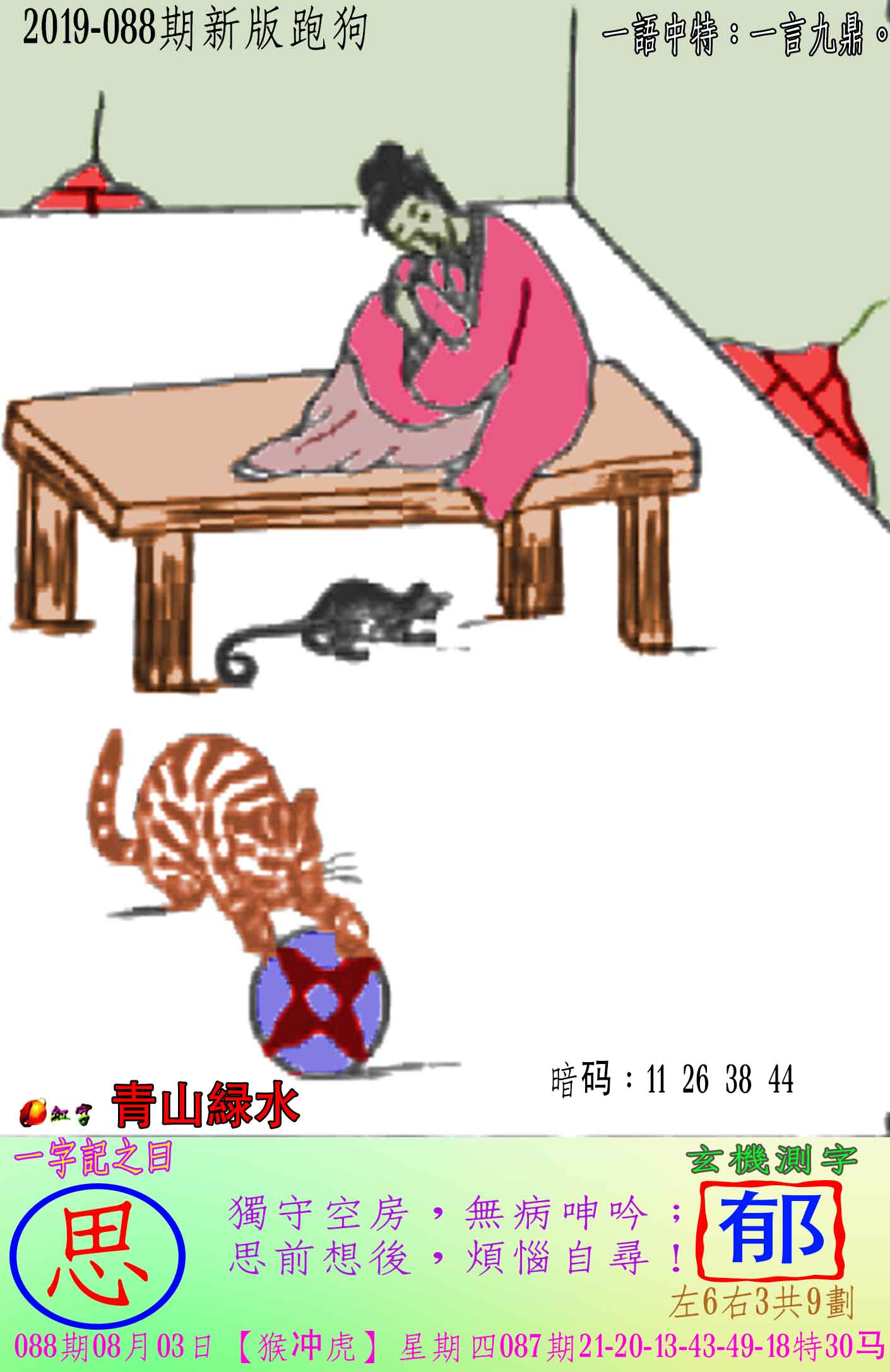 088期新版跑狗一字記之曰:【思】 獨守空房,無病呻吟; 思前想後,煩惱自尋! 玄機測字:《郁》 一語中特:一言九鼎