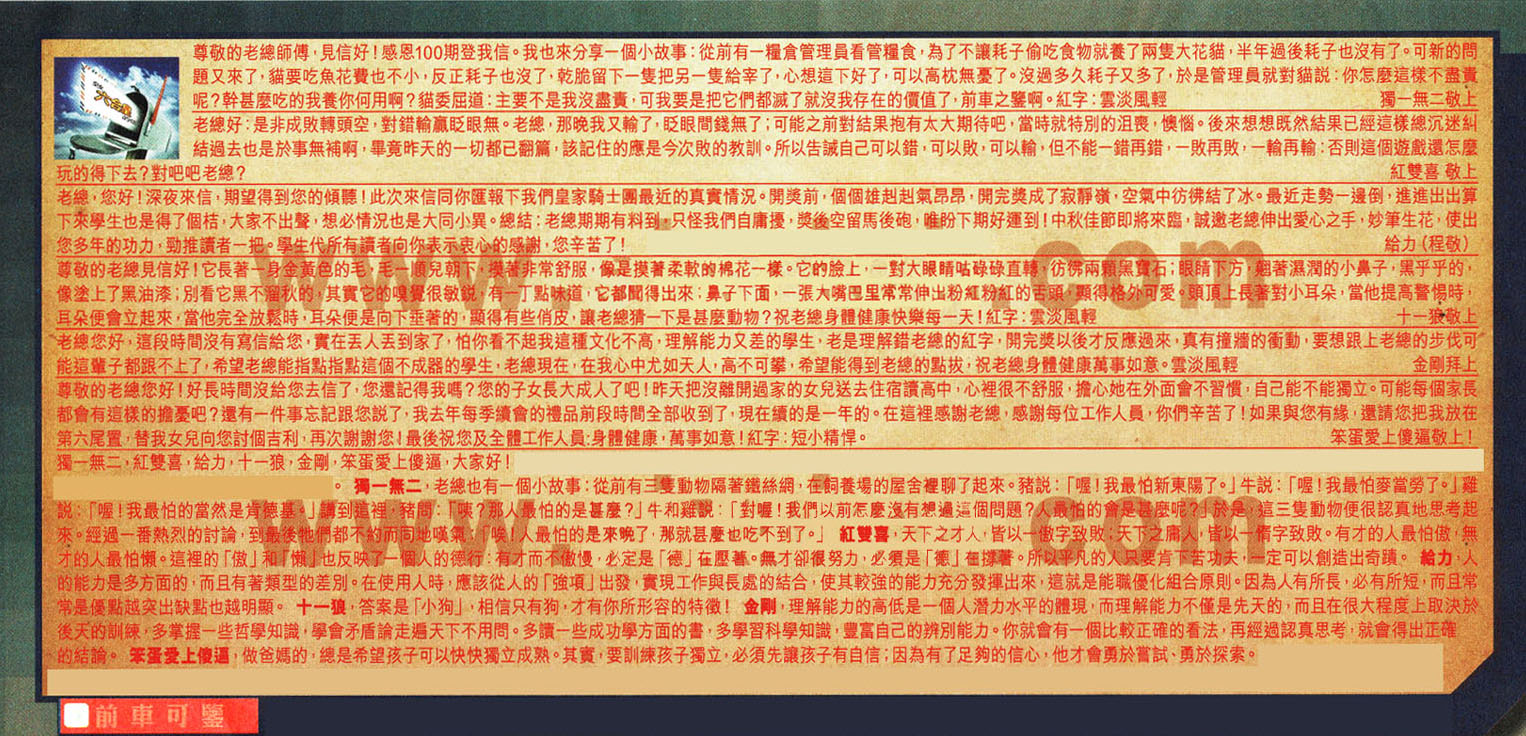 【6】尊敬的老總您好!好長時間沒給您去信了,您還記得我嗎?您的子女長大成人了吧!昨天把沒離開過家的女兒送去住宿讀高中,心裡很不舒服,擔心她在外面會不習慣,自己能不能獨立。可能每個家長都會有這樣的擔憂吧?還有一件事忘記跟您說了,我去年每季續會的禮品前段時間全部收到了,現在續的是一年的。在這裡感謝老總,感謝每位工作人员,你們辛苦了!如果與您有緣,還請您把我放在第六尾置,替我女兒向您討個吉利,再次謝謝您!最後祝您及全體工作人员:身體健康,萬事如意!紅字短小精悍。--- 笨蛋爱上傻逼敬上!