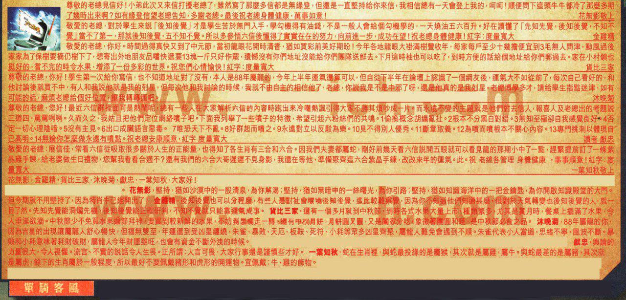 【5】尊敬的老總,您好!最近六信群裡面可是熱鬧呢,總有一些人在大家解析六信的内容時跑出來冷囑熱諷引得大家不勝其煩吵成一片。而永遠不變的主题就是他們對去信人,報喜人及老總出的考題說三道四,罵罵咧咧。久而久之,我姑且把他們定位網絡噴子吧。下面我列舉了一些嘖子的特徵,希望引起六粉絲們的共鳴。1偷換概念胡編亂扯。2根本不分黑白對錯。3無知至極卻自我感覺良好。4否定一切心理陰暗。5沒有主見。6出口成臟語言惡毒。7唯恐天下不亂。8好群起而嘖之。9永遠對立以反駁為樂。10見不得別人優秀。11斷章取義。12為噴而噴根本不關心內容。13專門挑刺以體現自已高明。14無論你怎麼做永遠有噴點。祝老總安康順意,紅字 度量寬大---讀者獻忠