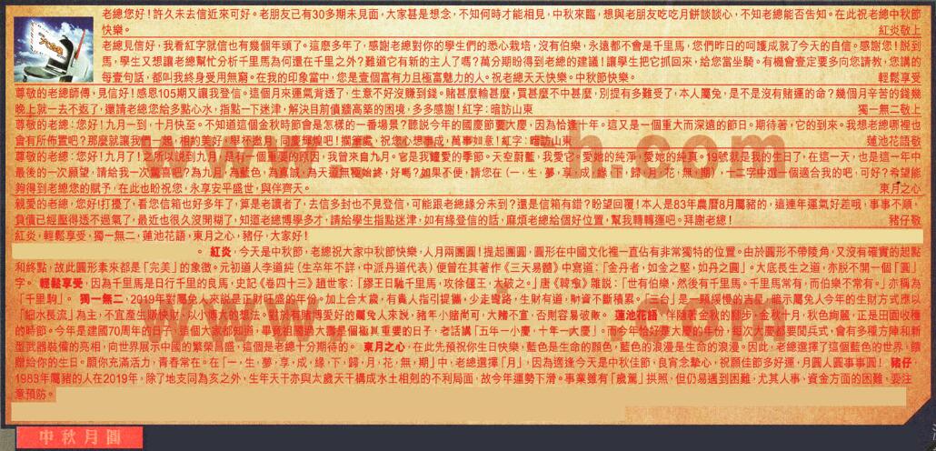 【1】.老總您好!許久未去信近來可好。老朋友已有30多期未見面,大家甚是想念,不知何時才能相見,中秋來臨,想與老朋友吃吃月餅談談心,不知老總能否告知。在此祝老總中秋節快樂。 紅炎敬上